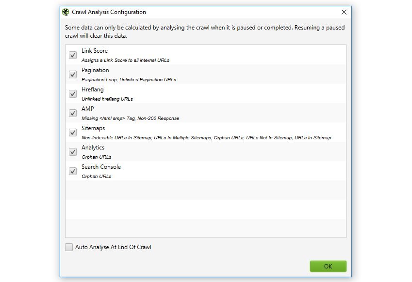 Il Seo Spider esegue i calcoli sul Link Score alla fine della scansione attraverso la “Crawl Analysis” che deve essere abilitata dal menu configurazioni.