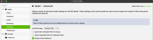 Abilitare questa configurazione significa che il ‘crawl depth limit’ viene ignorato e i redirect vengono seguiti fino a quando non raggiungono una risposta non-3XX (o fino a quando il tuo limite ‘Max Redirects To Follow’ viene raggiunto sotto ‘Config > Spider > Limits’). Questo ti evita di dover caricare più liste di URL di destinazione ogni volta per raggiungere la fine della catena.