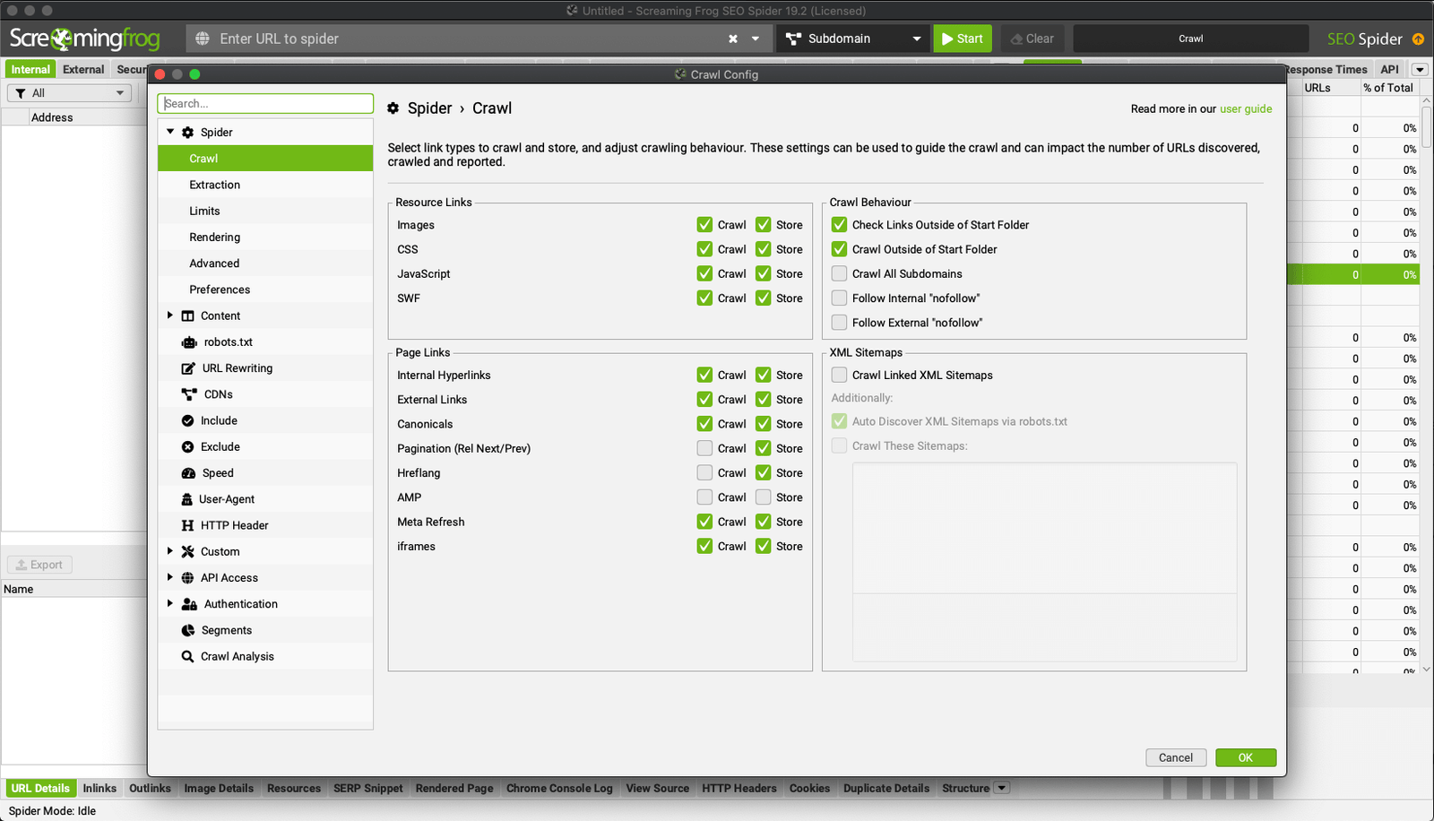 Il Seo Spider può anche essere configurato per scansionare solamente una sottocartella inserendo l’URL della “Subfolder” con relativo percorso e disabilitando “check links outside of start folder – controlla i link fuori dalla cartella iniziale” e “crawl outside of start folder – scansiona fuori dalla cartella iniziale”.