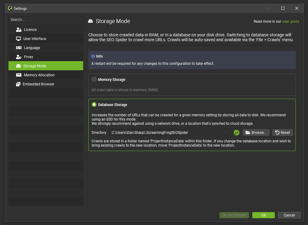 Le impostazioni di sistema come l’interfaccia utente, la lingua, la modalità di archiviazione e altro sono invece disponibili sotto ‘File > Impostazioni’ su Windows e Linux o ‘Screaming Frog SEO Spider > Impostazioni’ su macOS.